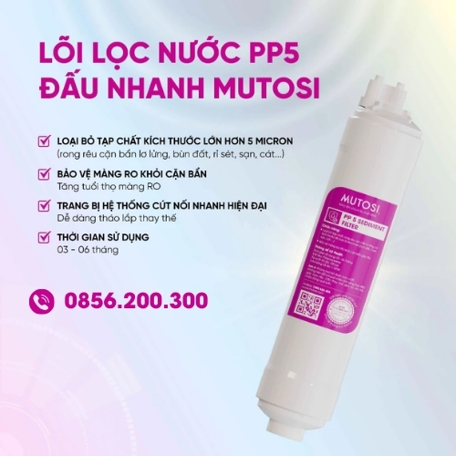 Lõi lọc thô đúc PP 5 micron Mutosi là lớp bảo vệ đầu tiên trong hệ thống lọc nước RO, giúp loại bỏ hiệu quả tạp chất thô như cát, sạn, rỉ sét, rong rêu… Có thiết kế đúc liền khối theo công nghệ Hàn Quốc cùng kết nối đấu nhanh hiện đại, sản phẩm này không chỉ giúp nâng cao hiệu suất lọc mà còn kéo dài tuổi thọ màng RO, đảm bảo nguồn nước luôn sạch và an toàn cho sức khỏe người dùng.