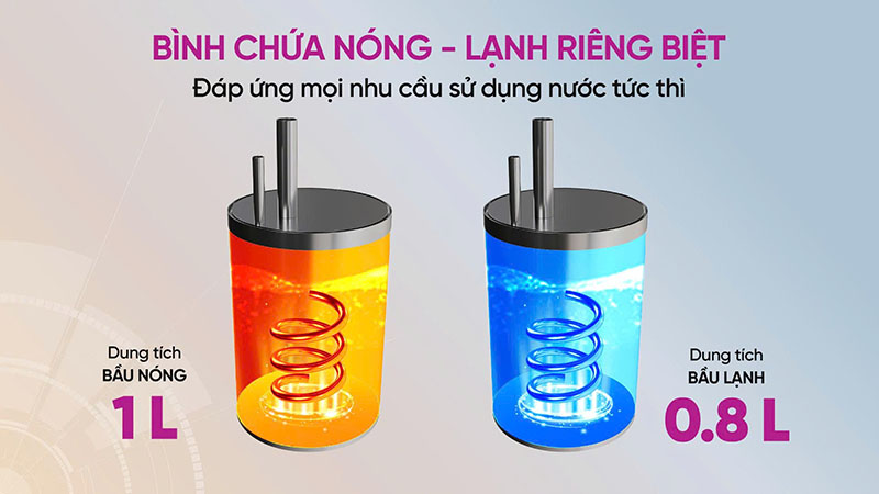 Với thiết kế bình nóng – lạnh riêng biệt, thiết bị có thể cung cấp nước ngay lập tức mà không cần chờ đun hay làm lạnh. Đây là điểm cộng lớn giúp tiết kiệm thời gian trong sinh hoạt hàng ngày.