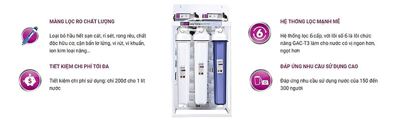 Hệ thống lọc giúp loại bỏ vi khuẩn, amip, asen và các chất độc hại. Nước sau lọc đạt chuẩn uống trực tiếp.