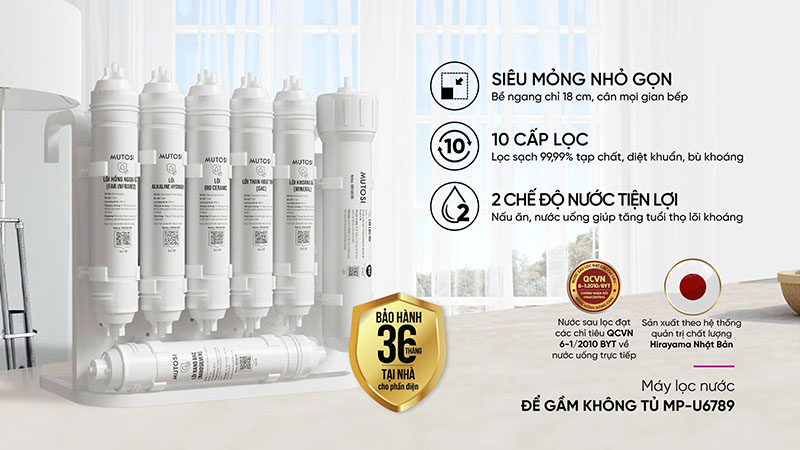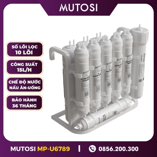 Máy lọc nước Mutosi MP-U6789 là dòng máy lọc nước để gầm không tủ được thiết kế nhỏ gọn, hiện đại, phù hợp với nhiều không gian bếp. Sản phẩm sở hữu 10 cấp lọc mạnh mẽ, giúp loại bỏ tới 99,99% tạp chất, vi khuẩn và kim loại nặng trong nước, mang đến nguồn nước sạch đạt chuẩn QCVN 6-1:2010/BYT – có thể uống trực tiếp tại vòi.