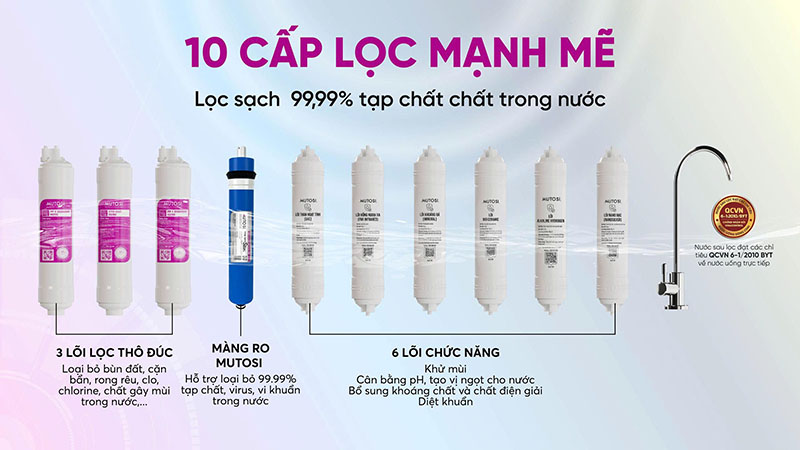 Máy lọc nước Mutosi MP-U6789 được trang bị hệ thống 10 cấp lọc hiện đại, giúp loại bỏ hiệu quả các chất gây hại trong nước như: Vi khuẩn, virus, clo dư, kim loại nặng, thuốc trừ sâu, các chất hữu cơ độc hại