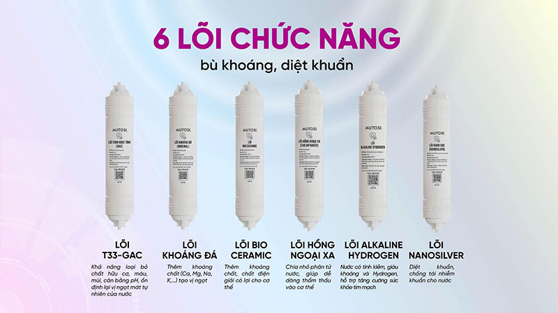 Sau khi lọc tinh khiết, nước tiếp tục đi qua 6 lõi chức năng giúp cải thiện chất lượng nước.