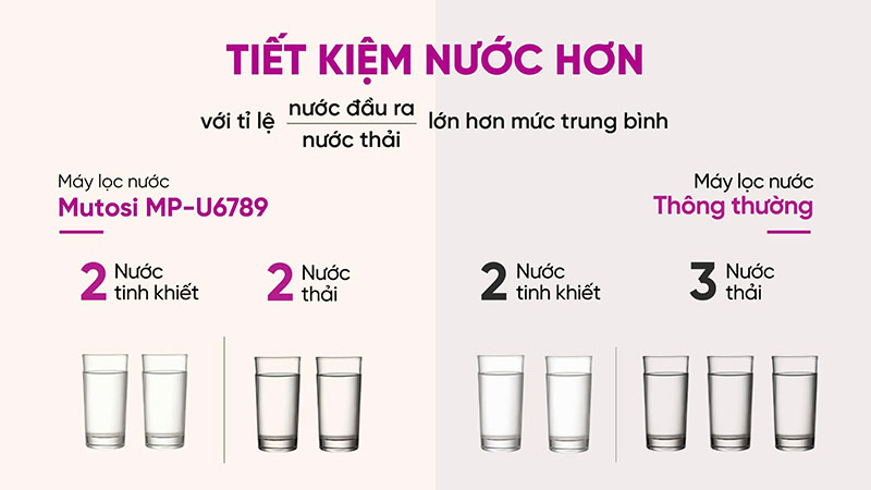 Máy lọc nước MP-U6789 có tỷ lệ lọc – thải tối ưu, giúp tiết kiệm nước hiệu quả.