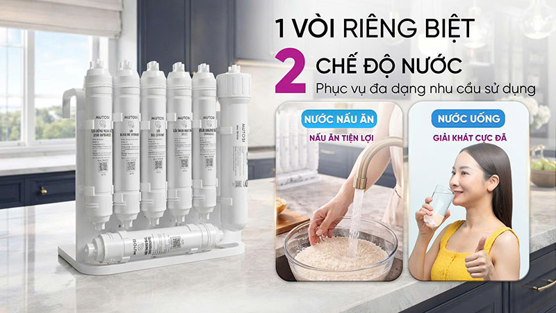 Điểm nổi bật của Mutosi MP-U6789 là thiết kế 1 vòi 2 chế độ nước tiện dụng, cho phép người dùng dễ dàng lựa chọn nước phục vụ nấu ăn hoặc uống trực tiếp. Nhờ đó, sản phẩm không chỉ cung cấp nước sạch mà còn giúp nâng cao chất lượng cuộc sống cho cả gia đình.