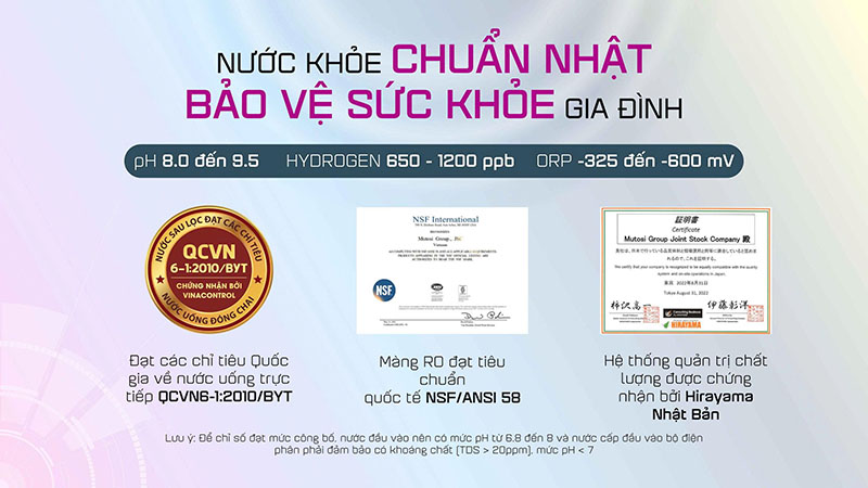 | Chỉ số nước | pH 8–9.5, Hydrogen 650–1200 ppb, ORP -325 đến -600 mV |