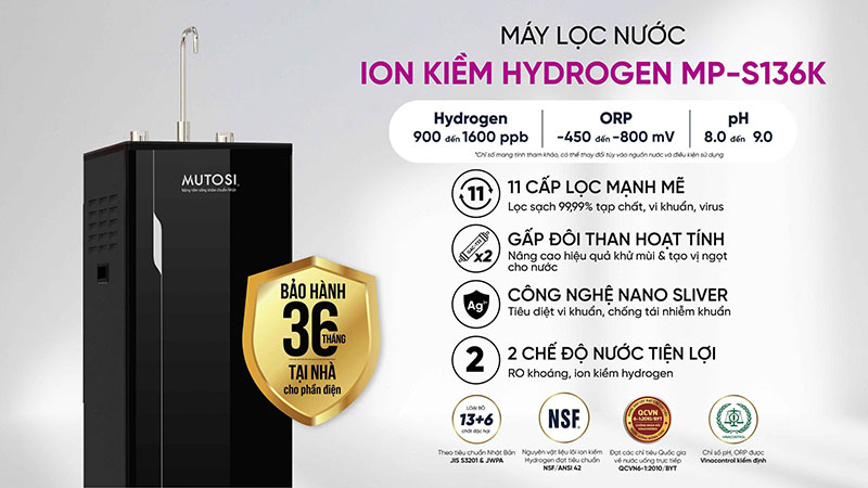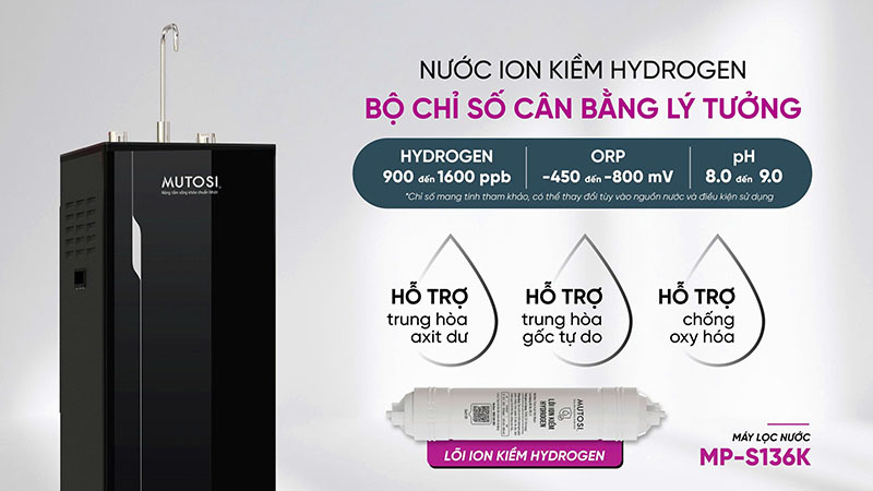Máy lọc nước Mutosi MP-S136K có khả năng tạo nước ion kiềm hydrogen với các chỉ số lý tưởng: