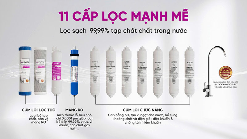 Máy lọc nước Mutosi MP-S136K sử dụng hệ thống lọc RO 11 cấp, giúp xử lý nước hiệu quả và nâng cao chất lượng nước.