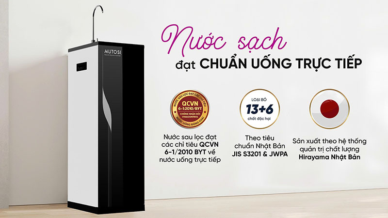 Máy lọc nước Mutosi MP-S68 mang đến nguồn nước đạt nhiều tiêu chuẩn chất lượng nghiêm ngặt. Sau khi đi qua hệ thống lọc RO, nước được loại bỏ 13 + 6 chất độc hại theo tiêu chuẩn Nhật Bản JIS S3201 & JWPA, giúp đảm bảo độ tinh khiết và an toàn cho sức khỏe.