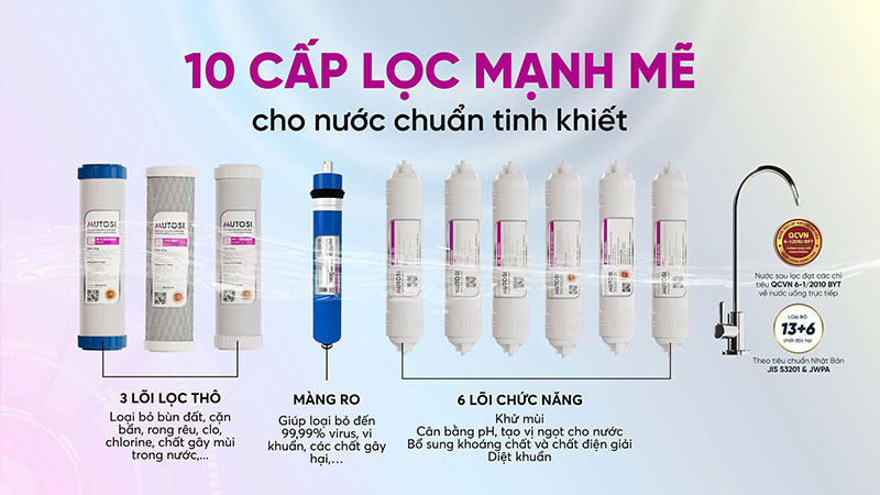 ♦ 10 lõi lọc RO mạnh mẽ, loại bỏ tới 99,99% vi khuẩn và tạp chất trong nước.