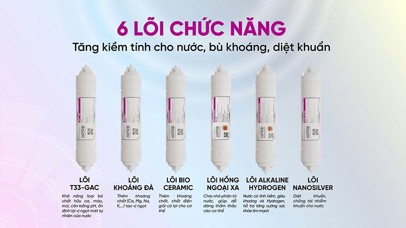 Sau khi được lọc tinh khiết, nước sẽ đi qua 6 lõi chức năng giúp cải thiện chất lượng nước và bổ sung khoáng chất cần thiết.