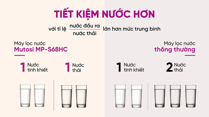 Máy lọc nước Mutosi MP-S68 có tỷ lệ thu hồi nước tinh khiết lên tới 50:50, giúp tiết kiệm nước đáng kể so với các dòng máy lọc nước thông thường.