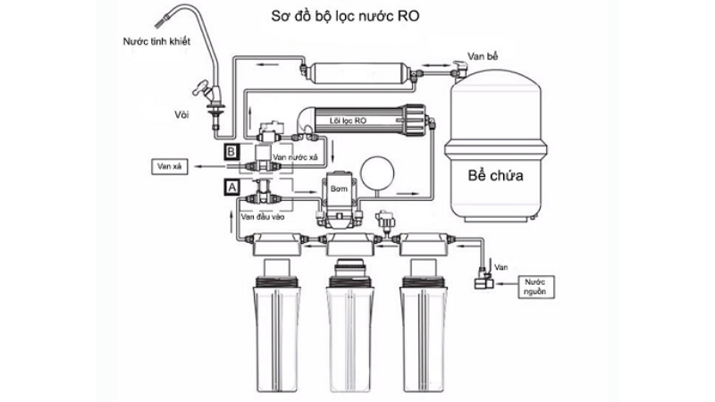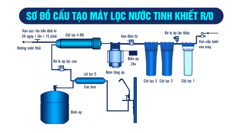 Nước từ nguồn → lọc thô → màng RO → lõi chức năng → bình chứa.