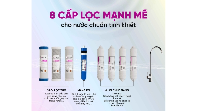 - Màng lọc RO: Loại bỏ 99,99% tạp chất, kim loại nặng, vi khuẩn nhờ công nghệ thẩm thấu ngược.