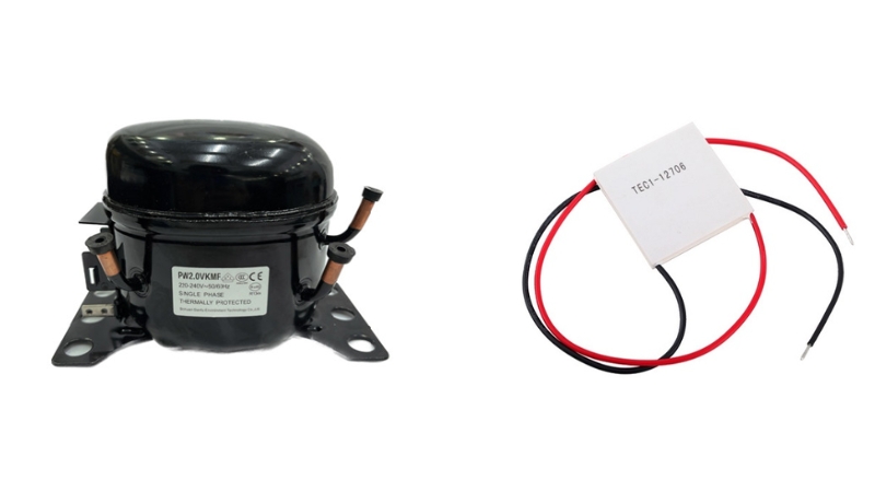 Chip Peltier làm lạnh nhanh, không gas, êm ái. Tuy nhiên, nhiệt độ lạnh thường không sâu bằng block.