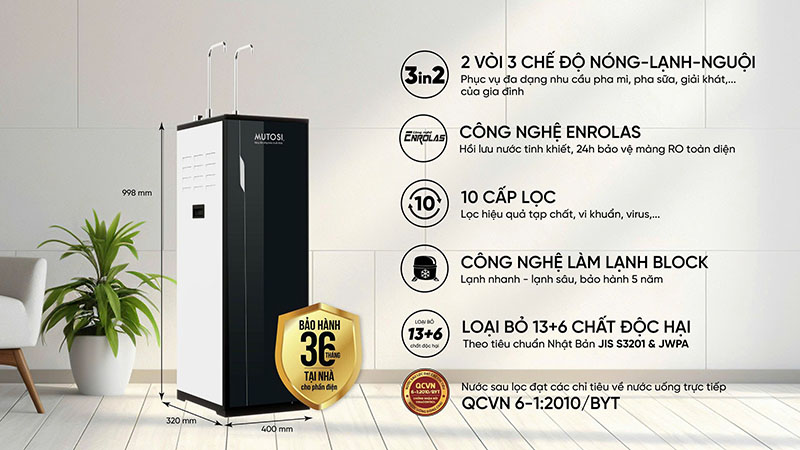 MÁY LỌC NƯỚC NÓNG LẠNH NGUỘI MUTOSI MP-S38HCE – CÔNG NGHỆ ENROLAS TĂNG TUỔI THỌ MÀNG RO