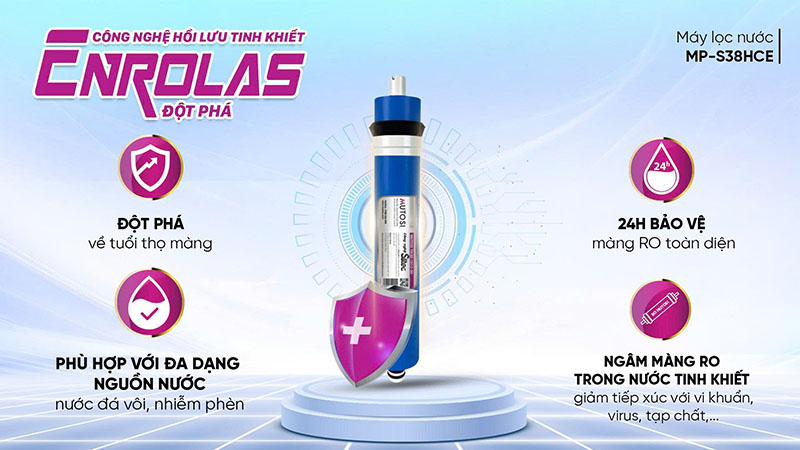 Điểm khác biệt lớn của MP-S38HCE nằm ở công nghệ Enrolas – hồi lưu nước tinh khiết. Công nghệ này giúp giảm tới 96% thời gian màng RO tiếp xúc với tạp chất, từ đó hạn chế tắc nghẽn và hư hỏng màng.
