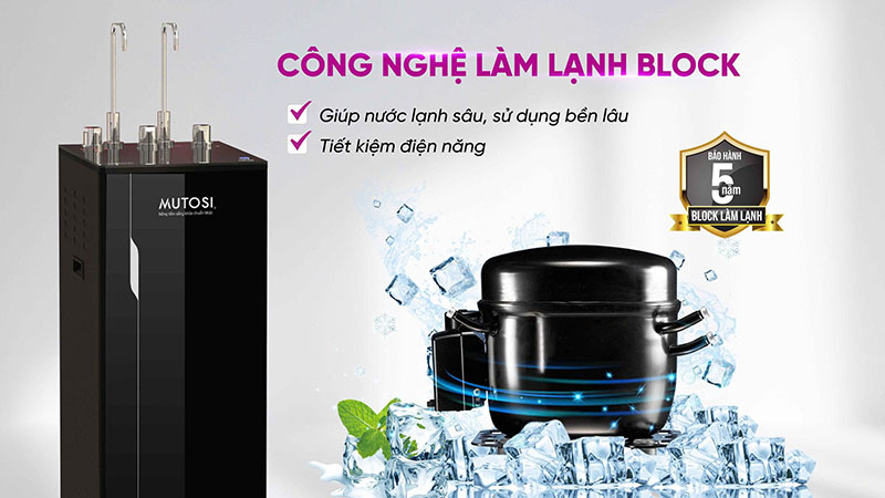 Máy sử dụng công nghệ làm lạnh Block, giúp nước lạnh sâu và ổn định hơn so với các công nghệ làm lạnh thông thường.