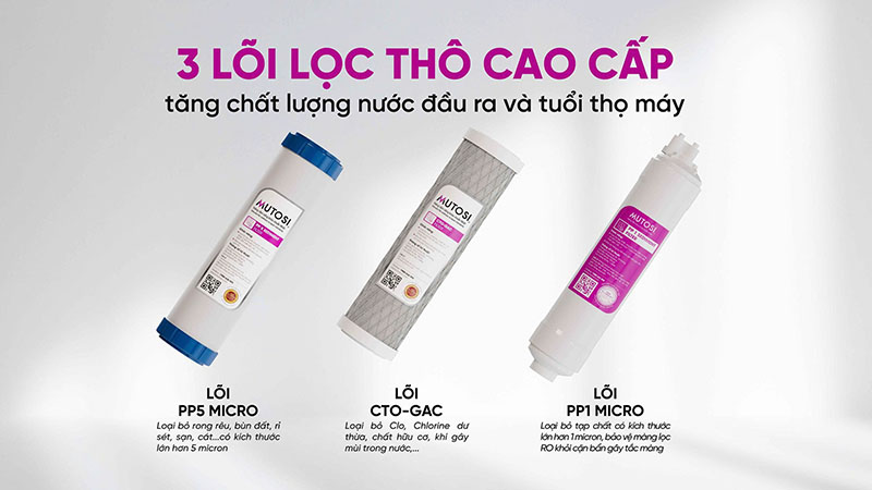 Ba lõi lọc đầu tiên giúp loại bỏ các tạp chất lớn và bảo vệ màng RO.
