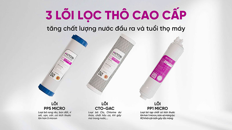 Ba lõi lọc đầu tiên giúp loại bỏ các tạp chất lớn và bảo vệ màng lọc RO.