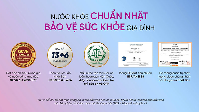 | Chỉ số nước ion kiềm | pH 8.5 – 9.5, Hydrogen 800 – 1200 ppb, ORP -400 đến -600 mV |