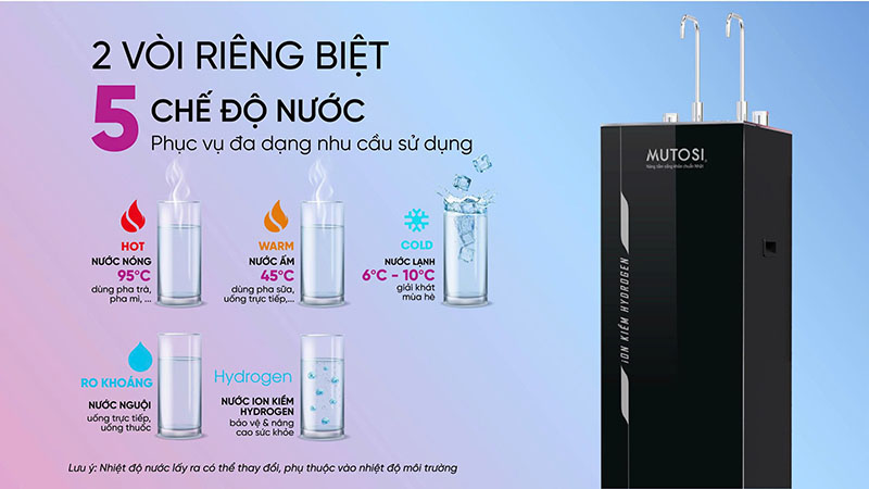 | Số loại nước | 5 (Nóng – Ấm – Lạnh – RO khoáng – Ion kiềm hydrogen) |
