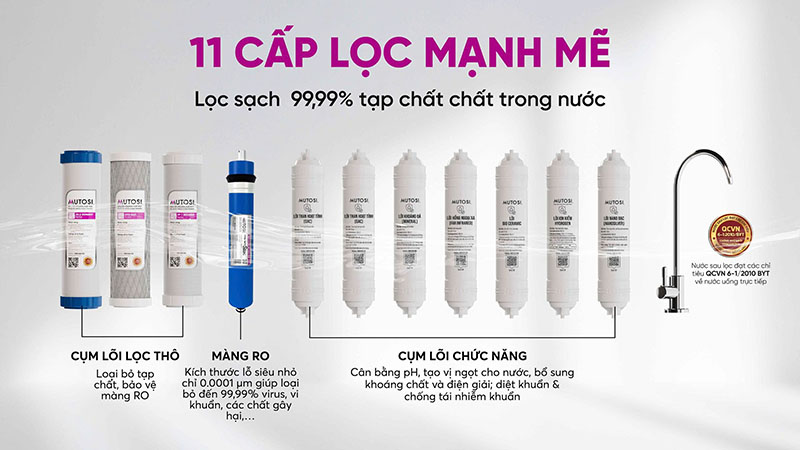 ✔ Màng RO Mutosi: Loại bỏ đến 99,99% vi khuẩn, virus, kim loại nặng như chì, thủy ngân, asen