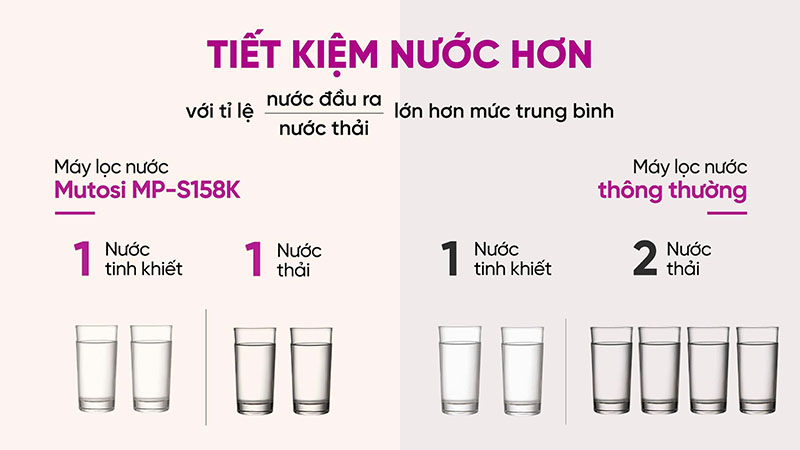 Máy có tỷ lệ thu hồi nước tinh khiết 50:50, giúp tiết kiệm nước hiệu quả so với các dòng máy thông thường.