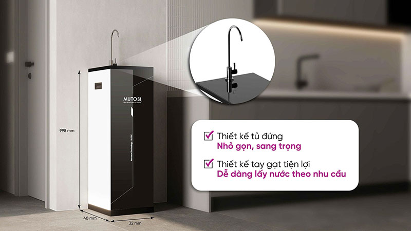Máy lọc nước Mutosi MP-S34 có thiết kế tủ đứng nhỏ gọn, phù hợp với nhiều không gian như: