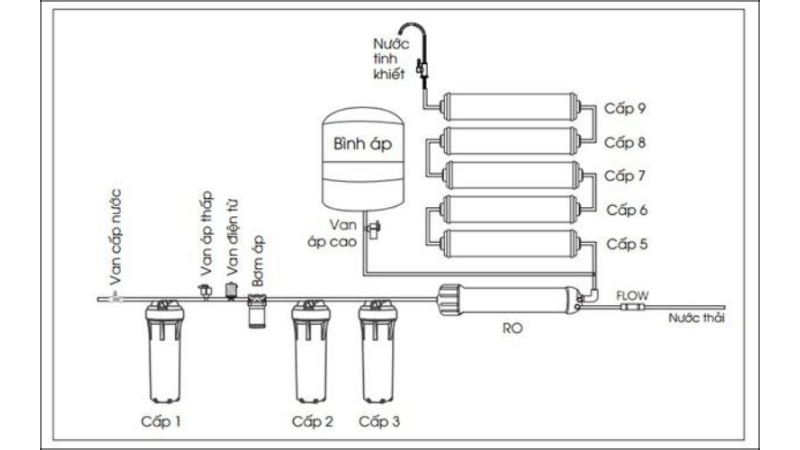 Máy lọc nước thường hoạt động dựa trên công nghệ lọc đa cấp, thường là RO. Nước đầu vào đi qua lõi lọc thô để loại bỏ cặn bẩn, sau đó qua màng RO loại bỏ 99,99% tạp chất, vi khuẩn và kim loại nặng.