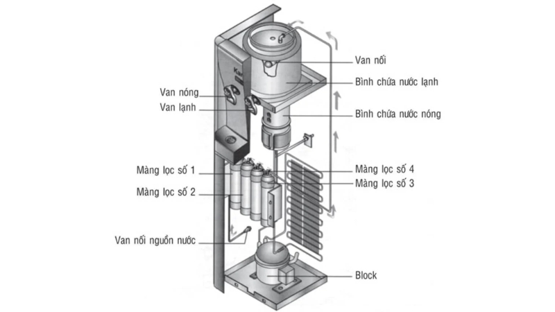 Nước sau lọc được lưu trữ riêng biệt: một phần giữ nguội, một phần được làm nóng đến 85-95°C và một phần làm lạnh xuống 6-10°C. Hệ thống tự động duy trì nhiệt độ nhờ rơ-le nhiệt.